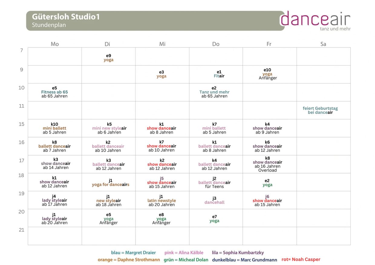 Hier sind die Kurse/ Zeiten / Dozenten und Altersklassen der Kurse zu sehen. Sollten sie weitere Fragen haben, so können sie uns gerne eine Email an Info@danceair.de schicken oder uns anrufen