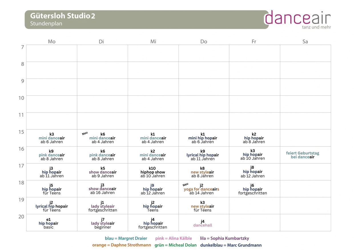 Hier sind die Kurse/ Zeiten / Dozenten und Altersklassen der Kurse zu sehen. Sollten sie weitere Fragen haben, so können sie uns gerne eine Email an Info@danceair.de schicken oder uns anrufen