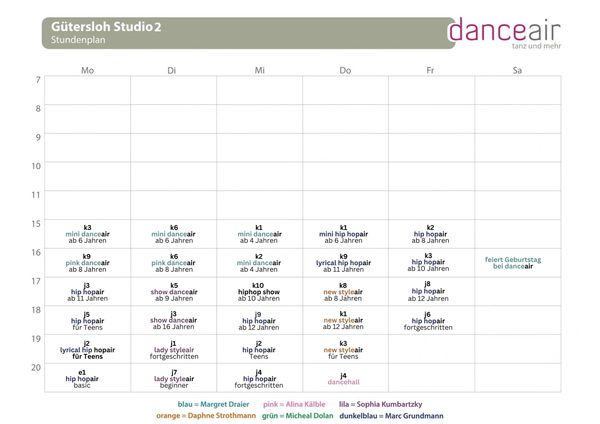 Hip-Hop als Tanz entstand aus Stilen des Straßentanzes in den USA. Neben dem sogenannten Breaking sind Popping und Locking weitere Hauptstile, wobei Hip-Hop Tänzer von verschiedensten Tanzrichtungen beeinflusst werden können. Entscheidend für diese Tanzform ist eine starke Körperspannung, die auf den Betrachter locker und fließend wirken soll. Bei danceair wird den Kindern Raum gegeben, die weiten Möglichkeiten des Hip-Hop Tanzens zu erlernen und auszutesten, während zugleich ihr Körper und Ausdruck geschult werden soll.