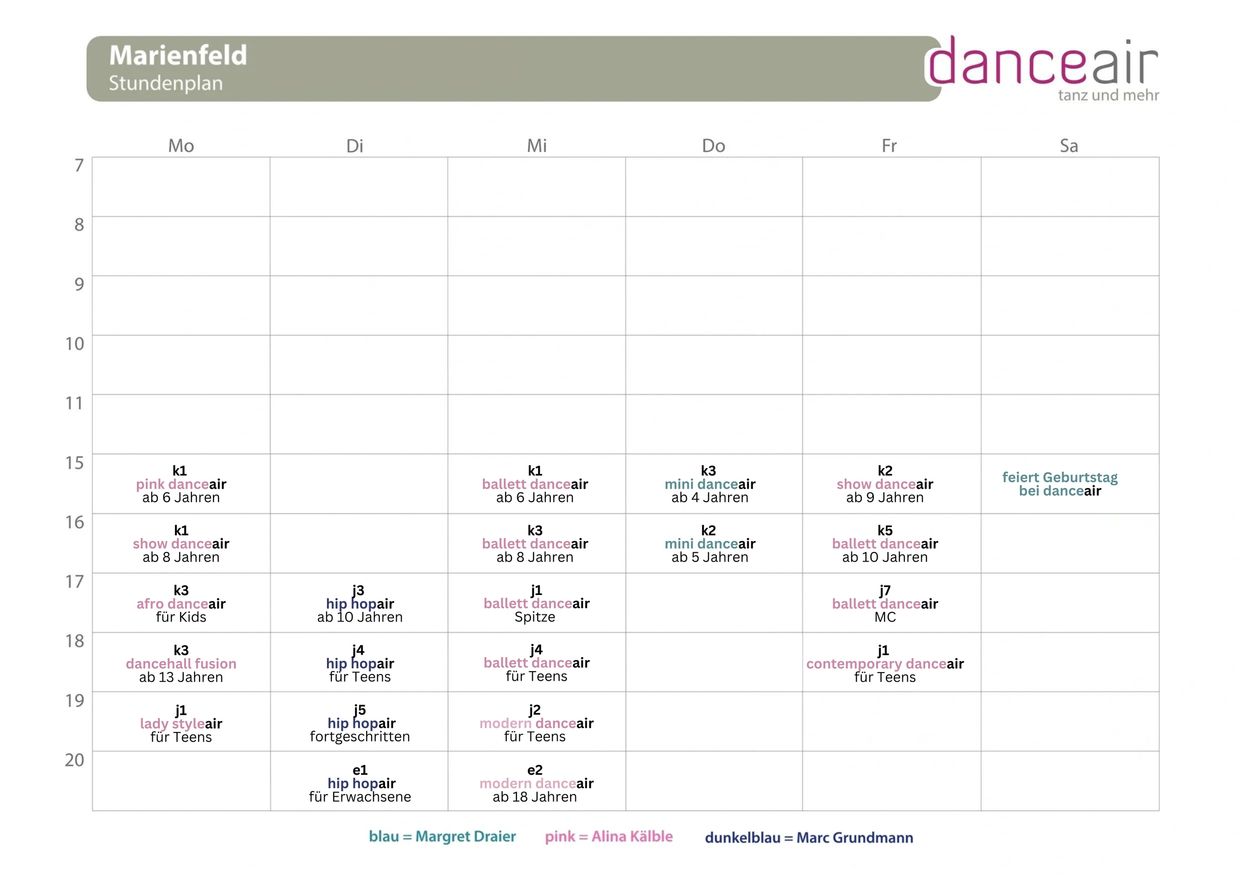 Hier sind die Kurse/ Zeiten / Dozenten und Altersklassen der Kurse zu sehen. Sollten sie weitere Fragen haben, so können sie uns gerne eine Email an Info@danceair.de schicken oder uns anrufen